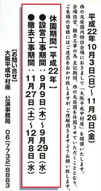ご存じの方も多いと思いますが、モトクロス大会「レッドブル・エックスファイターズ大阪2013」の開催に伴い西の丸庭園全域、内堀西側沿い通路、飛騨の森一部通路が下記の期間立ち入り禁止となります。 |
